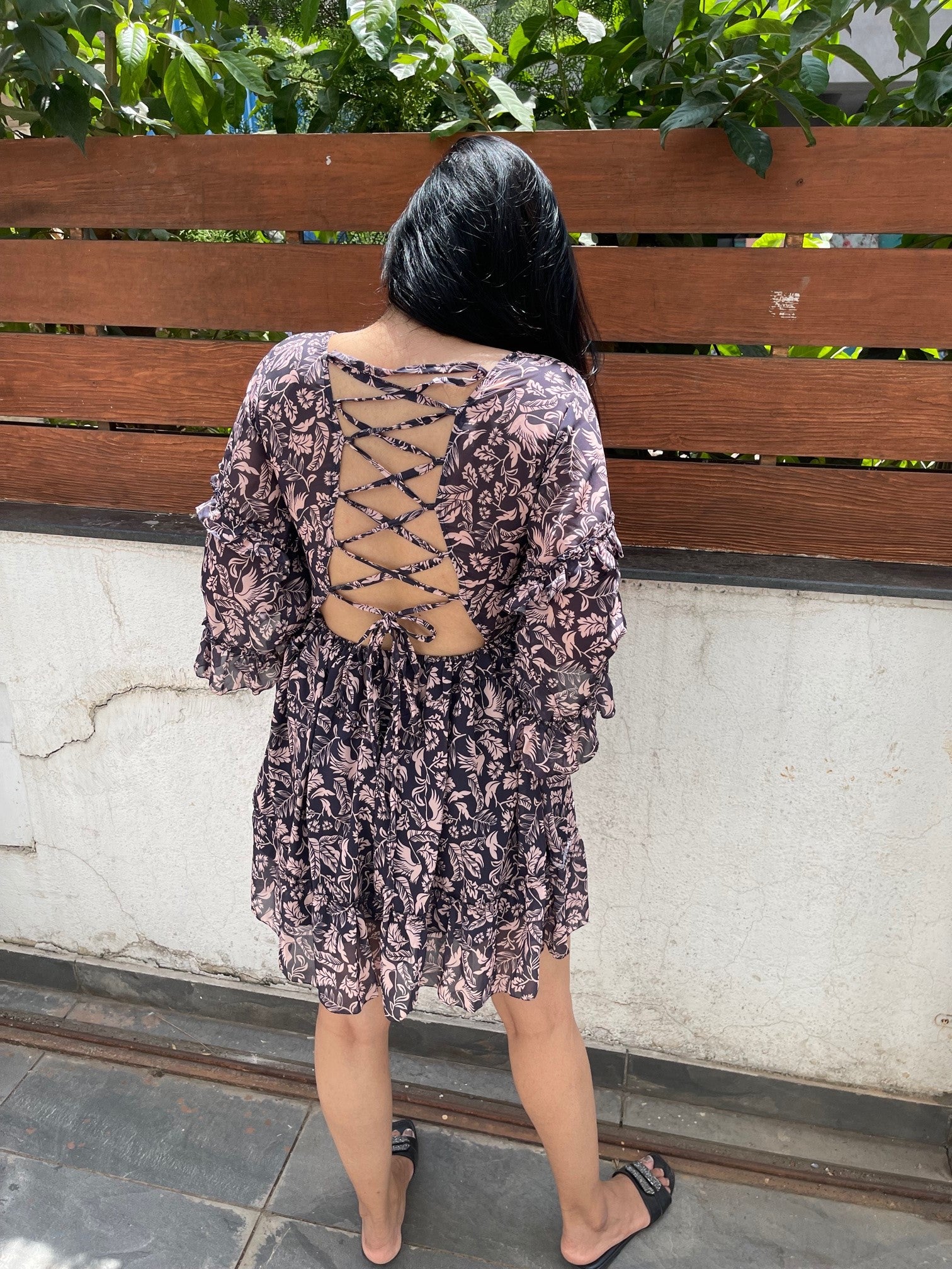 · V neckline with flares having adjustable strings at the back.