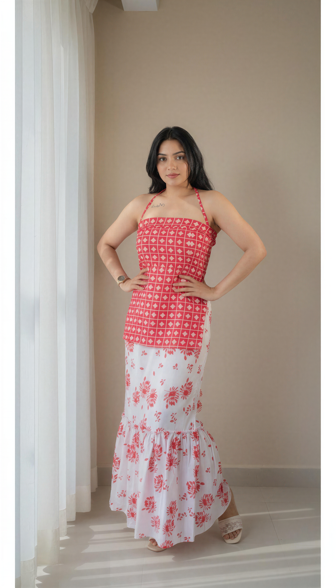 A breezy two-print fusion maxi dress featuring a geometric red halter-neck bodice that blends into a soft white floral tiered skirt. The contrast of bold patterns on top with delicate florals below gives it a summer-chic, effortless feminine vibe. Light, flowy and flattering — perfect for brunch days, beach evenings or sunny getaways