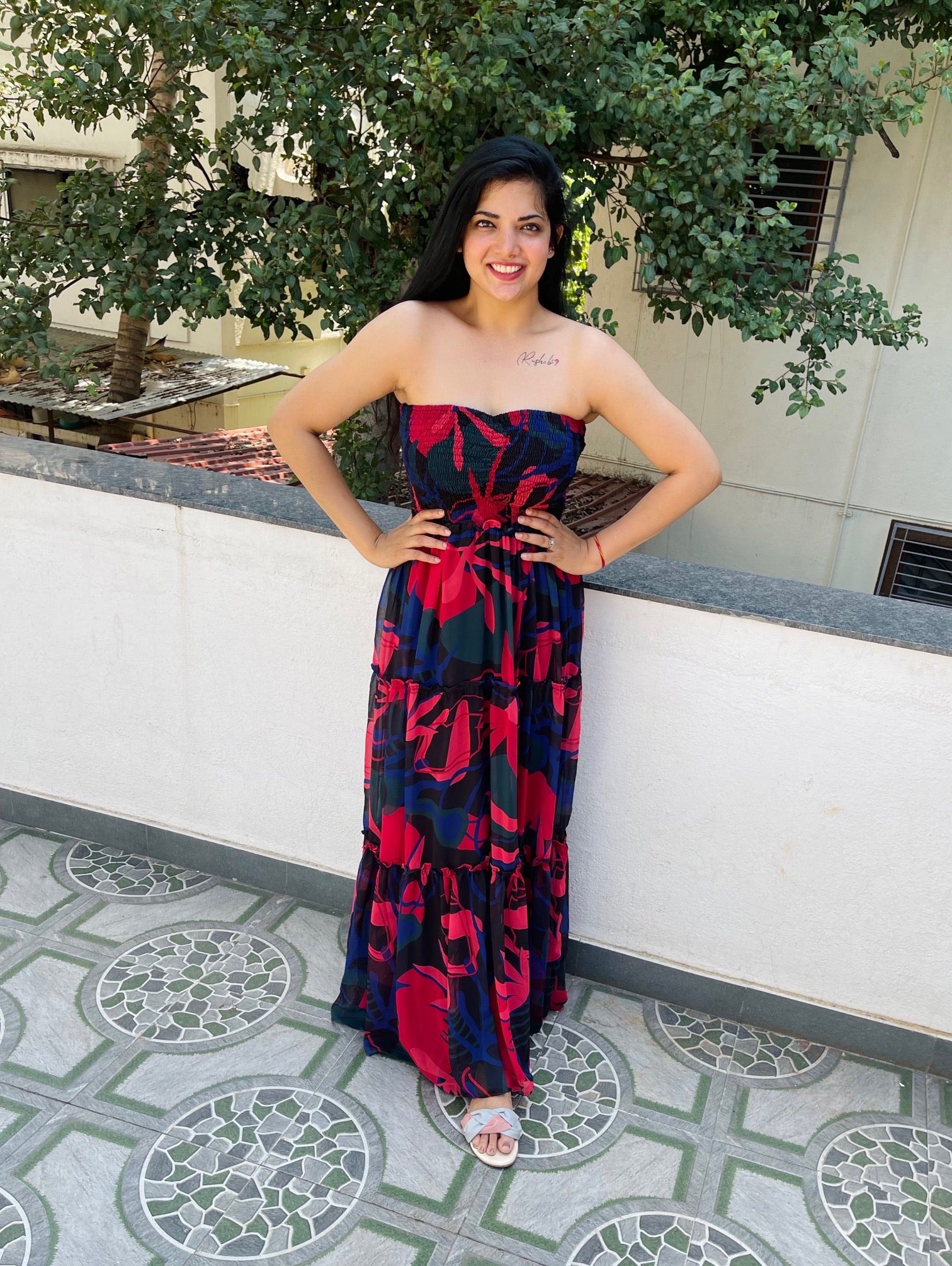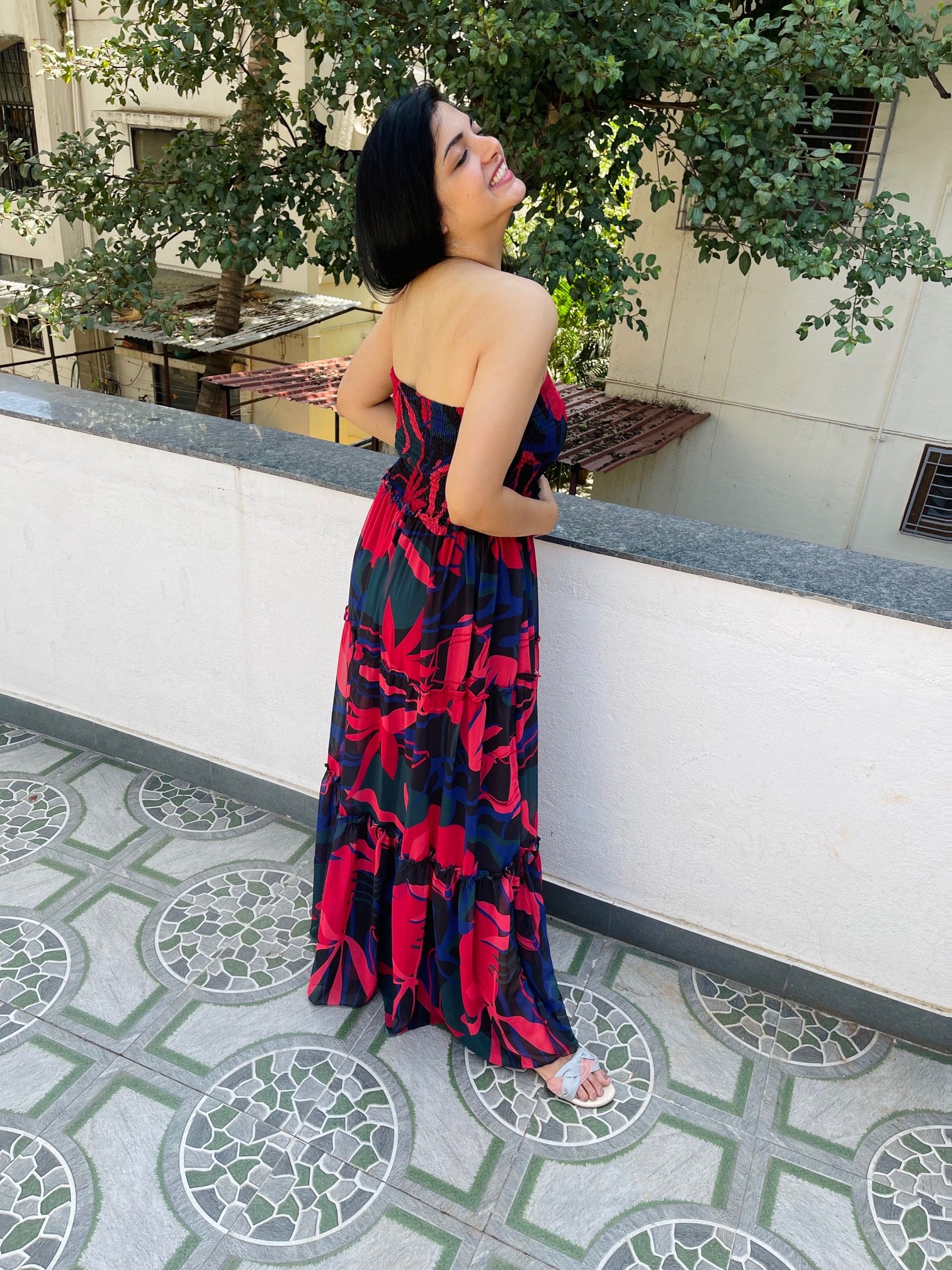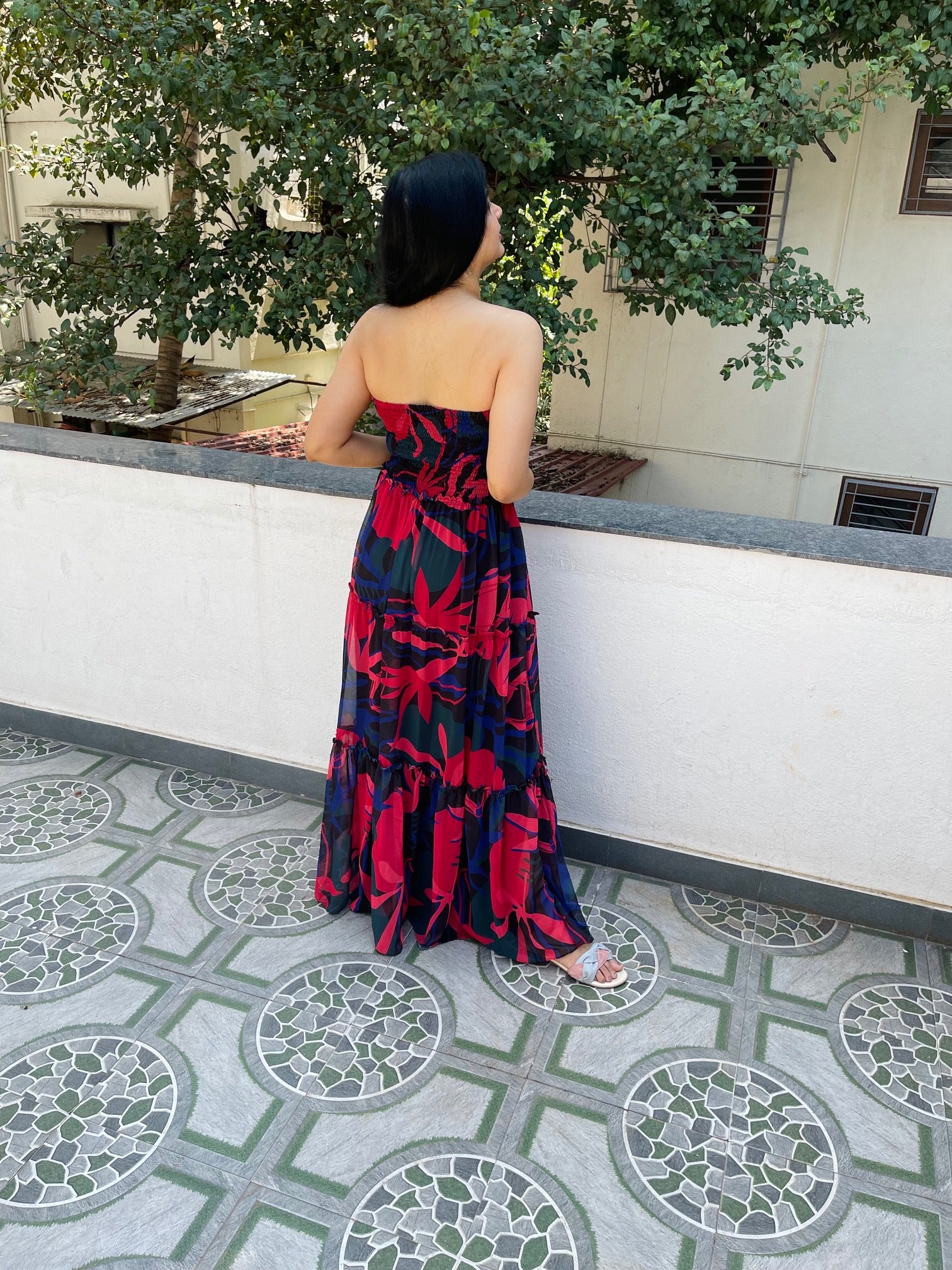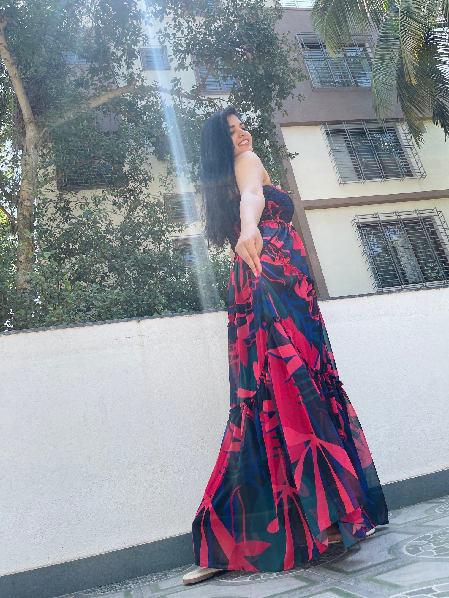 · Smocking neckline with flared full length dress.