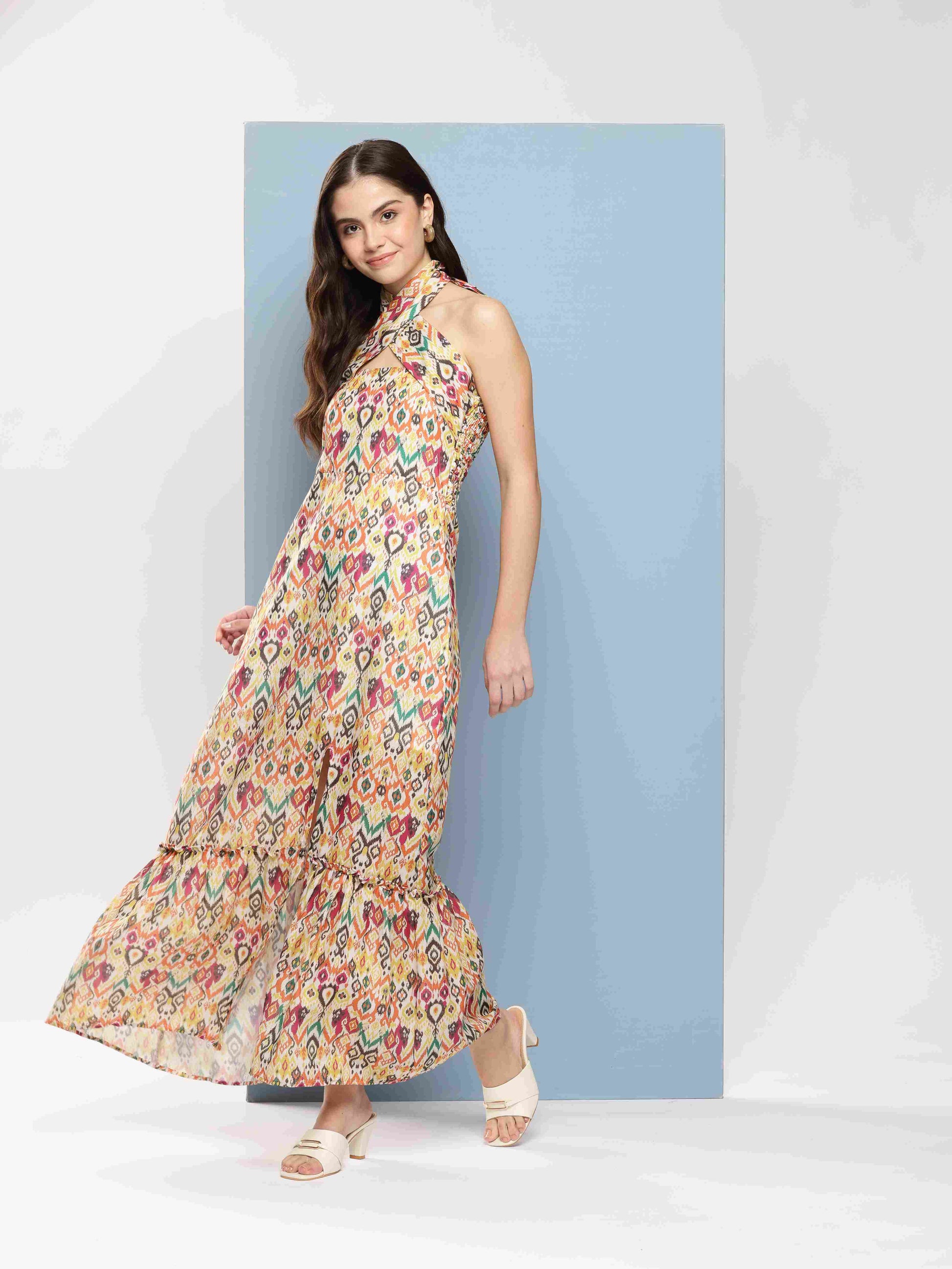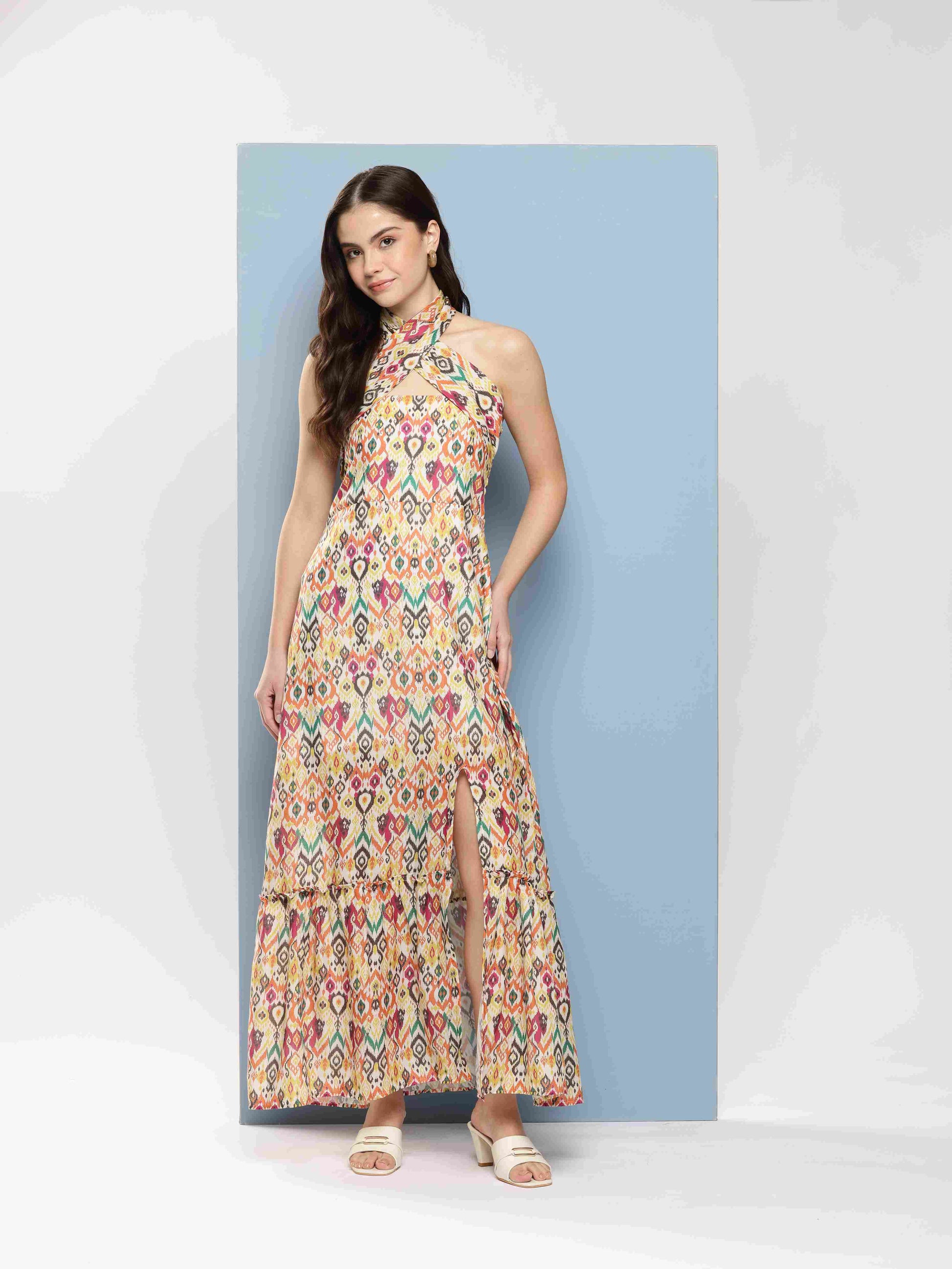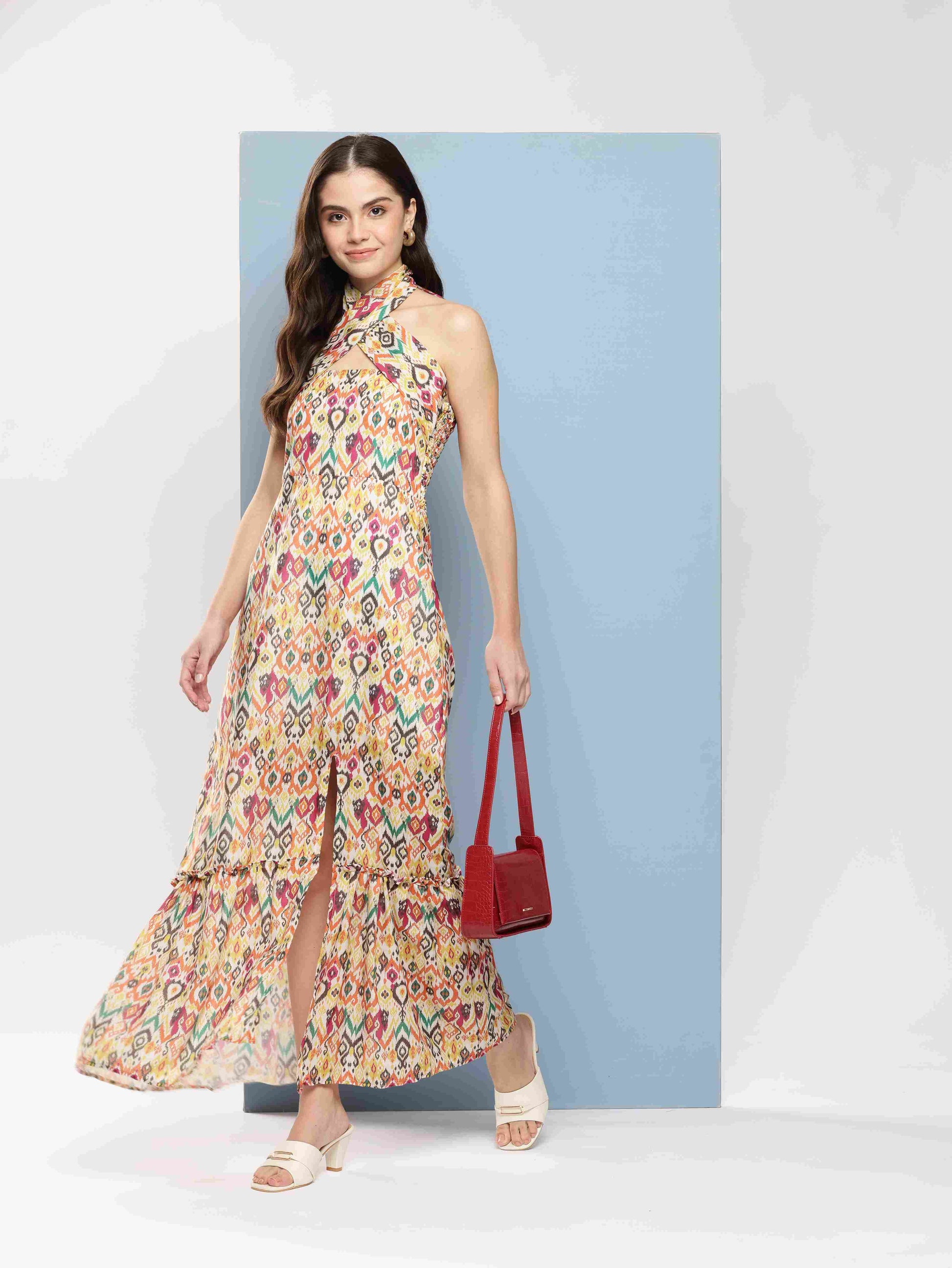 · Square neckline with flares having halter straps and a slit of 21 inches.