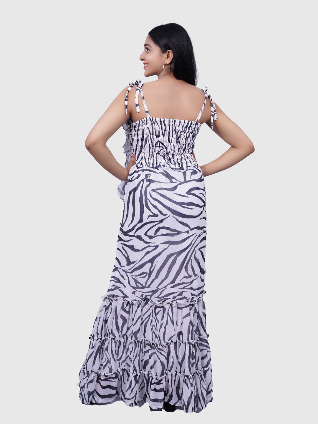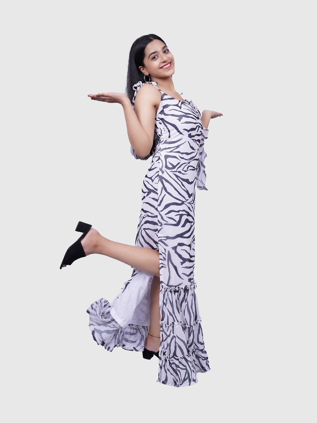 · Tie-up shoulder straps, three layered ruffles at the end and knee length side slits on both the sides.